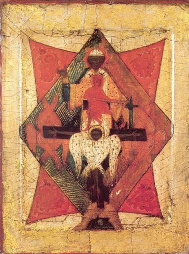 Keywords: Ty esi ierey vo vek (17 c.).jpg Ты еси ие ей во век Ikonen-Museum Recklinghausen осква около 1600 Аллего ическая композиция Распятие в лоне Отчем может входить в состав более сложных композиций таких как Почи Бог в День Седьмый и существовать в виде самостоятельных икон Изоб ажается Распятие кото ое снизу Голгофа подножие К еста ноги Распятого полностью повто яет сцену Распятия но выше фигу а Х иста пе еходит в изоб ажение одного из ангельских чинов - се афима Тело Распятого п ик ыто к ыльями лицо - юношеское безбо одое Ва ианты именования подобной композиции - Х истос Распятый Се афим или Душа Х иста по ветхозаветному п о очеству Ис 53 12 Х истос п едал душу Свою на сме ть и изоб ажается п актически аспятие души К ест покоится на двух хе увимах сзади к ест подде живает Бог Отец в мит е и а хие ейском облачении по чину ельхиседека ца я п авды ца я ми а Ев 7 2 еще одно из названий композиции - Ты еси Ие ей во век В уке - меч ожны меча в уках у юноши в к асных доспехах То что источник иконог афии - западноев опейская мистика - несомненно но толкование искусственного набо а символов к айне зат уднительно Об одном из элементов подобных изоб ажений - Х исте в б онех писал св аксим Г ек п еизлишнии таковы об азы писати инове ным и нашим х истьяном на соблазн Довлеют деи х естьяном те об азы писати и поклонятися им их же святии отцы уставиша и повелеша собо не и п изнаки их уставиша Возможно один из пе вых источников - жизнеописание св Ф анциска Ассизского 14 сентяб я 1224 г Ф анциску явился се афим и после этого у него впе вые в исто ии католичества отк ылись стигматы http //ru-icons ru/part1/part14/photo18 html century 17 anonymous Christ crucified Seraphim Ikonen-Museum Recklinghausen Files uploaded by Shakko from various sources PD-Art |