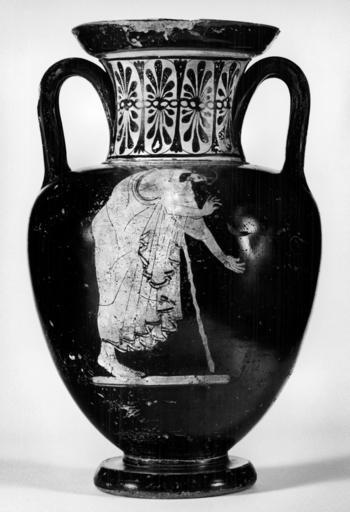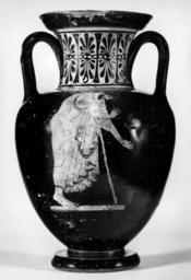 | Keywords: Tyszkiewicz Painter - Small Neck-Amphorae - Walters 4858 - Side A.jpg This amphora depicts a bearded mantled man on the front He is leaning over and resting on a staff to the right His head is lowered and he holds out a necklace or wreath in his hands for the woman on the back The paint for the object he holds is lost but the preliminary sketch indicates it was there or intended A woman on the back wears a chiton and mantle and stands to the left Her right arm is hidden underneath her drapery but her left hand and arm although covered by drapery can be perceived at her side Her hair is tied up in a bun at back Her pose with shoulders straight suggests that she is attentive to the offering of the man on the front ca 480 BC Classical terracotta H 12 11/16 x Max Diam 8 1/16 in 32 3 x 20 4 cm ; Diam at rim cm 14 6 ; Diam at foot cm 11 3 accession number 48 58 33313 Don Marcello Massarenti Collection Rome date and mode of acquisition unknown Henry Walters city Baltimore Walters Art Museum Henry Walters Acquired by Henry Walters with the Massarenti Collection 1902 place of origin Attica Greece Walters Art Museum license Ancient Greek red-figure pottery in the Walters Art Museum Tyszkiewicz Painter Media contributed by the Walters Art Museum needs category review Media contributed by the Walters Art Museum needs artist update |