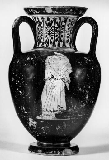| Keywords: Tyszkiewicz Painter - Small Neck-Amphorae - Walters 4858 - Side B.jpg This amphora depicts a bearded mantled man on the front He is leaning over and resting on a staff to the right His head is lowered and he holds out a necklace or wreath in his hands for the woman on the back The paint for the object he holds is lost but the preliminary sketch indicates it was there or intended A woman on the back wears a chiton and mantle and stands to the left Her right arm is hidden underneath her drapery but her left hand and arm although covered by drapery can be perceived at her side Her hair is tied up in a bun at back Her pose with shoulders straight suggests that she is attentive to the offering of the man on the front ca 480 BC Classical terracotta H 12 11/16 x Max Diam 8 1/16 in 32 3 x 20 4 cm ; Diam at rim cm 14 6 ; Diam at foot cm 11 3 accession number 48 58 33313 Don Marcello Massarenti Collection Rome date and mode of acquisition unknown Henry Walters city Baltimore Walters Art Museum Henry Walters Acquired by Henry Walters with the Massarenti Collection 1902 place of origin Attica Greece Walters Art Museum license Ancient Greek red-figure pottery in the Walters Art Museum Tyszkiewicz Painter Media contributed by the Walters Art Museum needs category review Media contributed by the Walters Art Museum needs artist update |