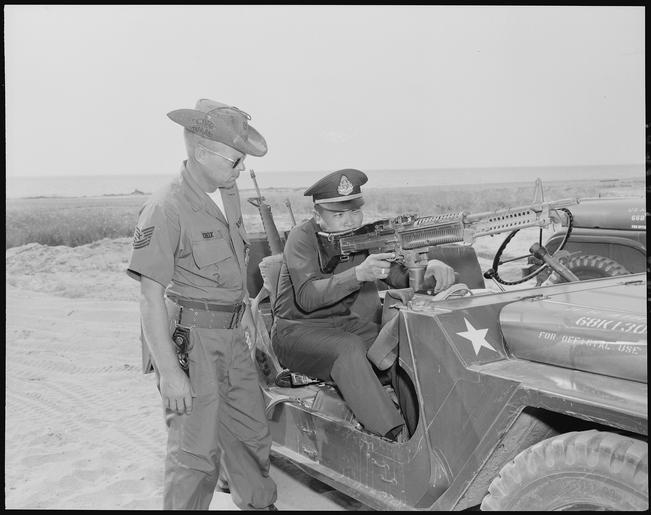 | Keywords: U.S. Air Force MSgt Jack Cheek of the 635 Security Police Squadron instructs Royal Thai Air Force Captain Kumron... - NARA - 542309.tif Scope and content General notes 542309 Local identifier 342-AF-105184USAF Department of Defense Department of the Air Force 09/26/1947 - Still Picture Records Section Special Media Archives Services Division NWCS-S National Archives at College Park 8601 Adelphi Road College Park MD 20740-6001 03/1969 Record group Record Group 342 Records of U S Air Force Commands Activities and Organizations 1900 - 2003 Record group ARC 654 Black and White Photographs of U S Air Force and Predecessors' Activities Facilities and Personnel Domestic and Foreign compiled 1930 - 1975 documenting the period 1863 - 1975 Series ARC 542185 File unit File unit ARC Variant control numbers NAIL Control Number NWDNS-342-AF-105184USAF yes Other versions NARA-cooperation PD-USGov United States Air Force Security Forces Royal Thai Air Force M60 machine gun |