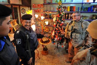 Keywords: U.S. Air Force Joint Patrol DVIDS130596.jpg en U S Air Force Capt Matthew Ballanco discusses Iraqi traditions with police within a store during a night-time patrol along the 60th Street Market area meeting Iraqi civilians handing out toys to the children and speaking with local business owners Nov 15 in the Al Doura community located in southern Baghdad Iraq The Airman is assigned to Detachment 3 732nd Expeditionary Security Forces Squadron 1st Brigade Combat Team 4th Infantry Division 2008-11-15 Petty Officer 2nd Class Todd Frantom https //www dvidshub net/image/130596 081115-N-+++++-389 2008-11-23 17 15 FORWARD OPERATING BASE FALCON IQ PD-USGov-Military-Navy Forward Operating Base Falcon Images from DoD uploaded by Fæ |
