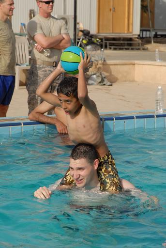 | Keywords: U.S. Air Force Capt. Frank Fappiano plays basketball Oct. 11, 2008, in the Australian swimming pool with an Iraqi boy scout during a visit to Camp Victory, Baghdad, Iraq 081011-N-YO258-040.jpg en U S Air Force Capt Frank Fappiano plays basketball Oct 11 2008 in the Australian swimming pool with an Iraqi boy scout during a visit to Camp Victory Baghdad Iraq 2008-10-11 MC2 James Wagner http //www defenseimagery mil/imageRetrieve action guid 0fde6bb4193fe267b99a12ced6efdd65e8a4533b t 2 Public domain photograph from defenseimagery mil http //www defenseimagery mil/imagery html guid 0fde6bb4193fe267b99a12ced6efdd65e8a4533b 081011-N-YO258-040 2008-10-24 Camp Victory PD-USGov-Military-Navy Camp Victory Images from DoD uploaded by Fæ |