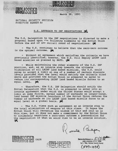 | Keywords: U.S. Approach to INF Negotiations - NARA - 198235.tif Scope and content General notes 198235 Local identifier President 1981-1989 Reagan National Security Council 1981 - 1989 Ronald Reagan Library NLRR 40 Presidential Drive Simi Valley CA 93065-0600 1983-03-28 Record group Collection RR-NSC Numbered National Security Policy Papers 1981 - 1989 Record group ARC 1189 National Security Decision Directives compiled 02/25/1981 - 01/19/1989 Series ARC 198166 File unit File unit ARC Variant control numbers NAIL Control Number NLS-NSC-NSDD-86 yes Other versions <gallery> File U S _Approach_to_INF_Negotiations_-_NARA_-_198235 tif tif File U S _Approach_to_INF_Negotiations_-_NARA_-_198235 jpg jpg </gallery> NARA-cooperation PD-USGov Presidential Decision Directives Reagan NARA TIF images with categorized JPGs |