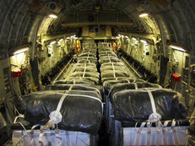 Keywords: U.S. Humanitarian Airdrop over Iraq August 8.jpg en Pallets of bottled water are loaded aboard a U S Air Force C-17 Globemaster III aircraft in preparation for a humanitarian airdrop over Iraq Aug 8 2014 Airmen with the 816th Expeditionary Airlift Squadron airdropped 40 bundles of water for displaced citizens in the vicinity of Sinjar Iraq The president authorized U S Central Command to conduct military operations in support of humanitarian aid deliveries and targeted airstrikes in Iraq to protect U S personnel and interests in response to activities conducted by Islamic State in Iraq and the Levant ISIL terrorists U S Air Force photo by Staff Sgt Vernon Young Jr /Released 2014-08-11 00 07 40 http //www dvidshub net/image/1493229/isil-response U-hBalVdWUk Defense Video and Imagery Distribution System U S Air Force photo by Staff Sgt Vernon Young Jr PD-USGov Uploaded with UploadWizard Uncategorized 2014 August 11 |