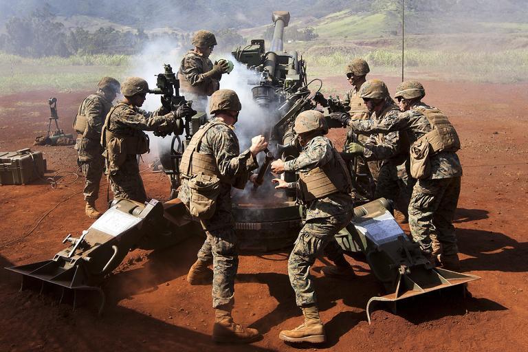 Keywords: U.S. Marines Reload M777 During Training.jpg en Marines with Bravo Battery 1st Battalion 12th Marine Regiment hastily reload an M777 howitzer with a 155 mm artillery shell during a multiple-rounds fire mission as a part of a two-day dual-fire training exercise at Schofield Barracks Hawaii Nov 13 2013 The M777s fired alongside M327 Towed-Rifled Mortar Systems to eliminate the possibility of short-range threats on the battlefield and to expand the capabilities of the battery as a whole 2013-11-14 https //www flickr com/photos/marine_corps/10944472535 Marines other versions United States Marine Corps Official Page https //flickr com/photos/40927340 N03/10944472535 2016-01-06 20 27 16 United States Government Work PD-USGov United States Marine Corps Uploaded with UploadWizard |