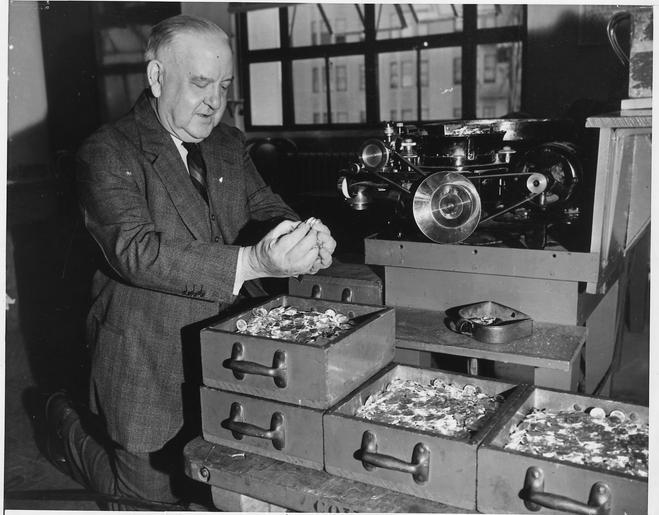 | Keywords: U.S. Mint at Frisco Makes Coins for China - NARA - 296602.tif Scope and content For two months employees of the San Francisco Federal Mint worked behind the bullet-proof enclosuresmaking more than 10 million coins for the Chinese government After the mint in Shanghai closed the Chinese sent 150 tons of silver and copper alloys to San Francisco so that the money could be made More than 3 000 000 dollars and twice as many half-dollars were ordered The photograph shows Peter J Haggerty Superintendent of the Mint looking over part of the production of Chinese coins General notes 296602 Local identifier Department of the Treasury Bureau of the Mint U S Mint San Francisco California 1873 - 07/11/1962 NARA's Pacific Region San Bruno NRHAS 1000 Commodore Drive San Bruno CA 94066-2350 1998-06-25 Record group Record Group 104 Records of the U S Mint 1792 - 2007 Record group ARC 433 Photographs of Mint Operations compiled ca 1885 - ca 1938 Series ARC 296601 File unit File unit ARC Variant control numbers NAIL Control Number NRHS-104-SFMNTMINTOPS-SF454319 yes Other versions <gallery> File U S _Mint_at_Frisco_Makes_Coins_for_China_-_NARA_-_296602 tif tif File U S _Mint_at_Frisco_Makes_Coins_for_China_-_NARA_-_296602 jpg jpg </gallery> NARA-cooperation PD-USGov Coins of China NARA TIF images with categorized JPGs |