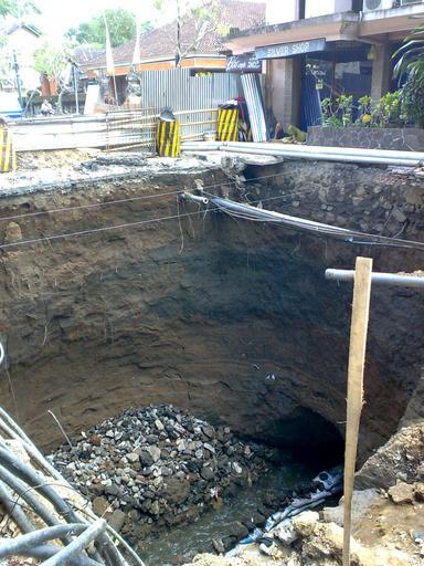 | Keywords: Ubud-Jalan Raya-Pothole-2009.jpeg en Jalan Raya main road of Ubud Bali Indonesia In early July 2009 a pothole appeared in front of the market pasar Then the road began to subside and some barriers went up The sound of running water was heard from rather far below the hole The market is was often visited by large Mercedes Benz buses bringing mostly Taiwanese tourists on day-trips to Ubud They're heavy and often break roads Some time ago 40+ years there was a bridge here over a river and a culvert was constructed out of stone and mortar and a lot of dirt thrown on top This was decades before electricity or pavement made it to town The culvert has disintegrated and the river has eroded away everything under the road After a few days of watching the hole expand and scrambling to rearrange the directionality of streets an excavator was brought in to see what's down there; down about 10 metres The river and some stones No one knows what's going to happen Some senior people from the provincial government came for a look-see a week later The culvert is hundreds of metres long and runs under the main parking lot of the market and a number of large buildings all owned by the palace; My guess is at least a year to sort the mess with the buildings coming down and the market relocated out of town own Jack Merridew 2009-07-31 8 30 26 45 S 115 15 48 64 E Ubud Roads in Bali Power generation transportation and distribution in Indonesia |