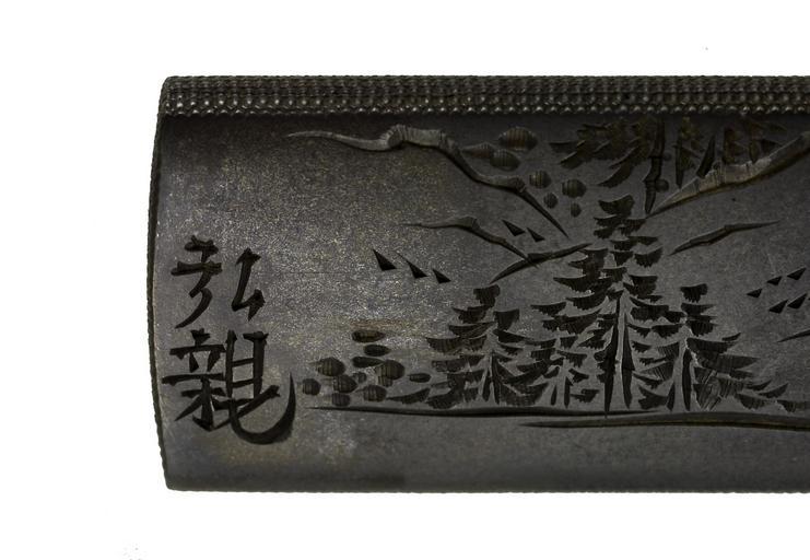 | Keywords: Uchikoshi Hirochika - Kozuka of a Flintlock Pistol - Walters 51752 - Mark A.jpg  On the front of the kozuka is a relief carving of a pistol made of gold silver and copper The subject matter is an interesting pairing with the traditional sword on which the kozuka would have been mounted On the reverse is a landscape scene The edge of a torii gate is visible on the right with a path extending towards the left into trees The artist's signature is also on the reverse ca 1825 late Edo shibuichi gold silver copper cm 9 6 accession number 51 752 5034 William T / Henry Walters Collection Baltimore date and mode of acquisition unknown Walters Art Museum Henry Walters Acquired by William T or Henry Walters Signature Hirochika place of origin Japan Walters Art Museum license Tosogu Japanese sword fittings in the Walters Art Museum Uchikoshi Hirochika Media contributed by the Walters Art Museum needs category review |