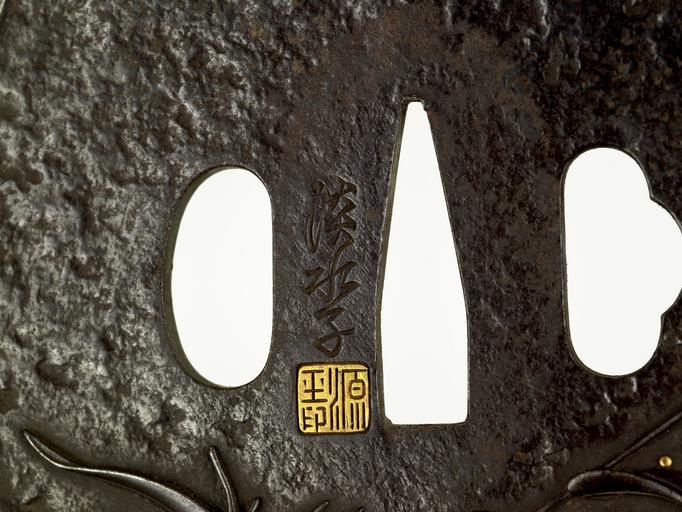 | Keywords: Ueda Kazutsune - Tsuba with a "Ja-kago" (Gabion) and Reeds - Walters 5191 - Mark.jpg This autumn theme shows seasonal plants alongside a bamboo basket filled with stones under a full moon Baskets of this type were used for erosion control along river banks so the image also invokes water The reverse side continues the botanical theme Autumn is the traditional season of moon viewing and this tsuba evokes the quiet of an autumn night between 1848 1868 late Edo iron gold detail cm 8 5 8 2 accession number 51 91 1104 Henry Walters Baltimore date and mode of acquisition unknown Walters Art Museum Henry Walters Acquired by Henry Walters Signature Tansuishi; Seal gen in place of origin Wakayama Japan Walters Art Museum license Tosogu Japanese sword fittings in the Walters Art Museum Ueda Kazutsune Media contributed by the Walters Art Museum needs category review |