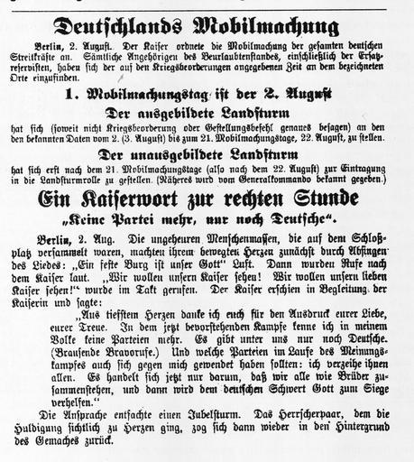 | Keywords: Uetersen Mobilmachung 1914.jpg de Extra-Ausgabe der Uetersener Nachrichten von Sonntag den 2 August 1914 Deutsche Mobilmachung eigene reproduktion das Original mehr als 70 Jahre alt own reproduktion original is more than 70 years old Author 1914-08-02 Germany in World War I Documents of Uetersen World War I PD-old |