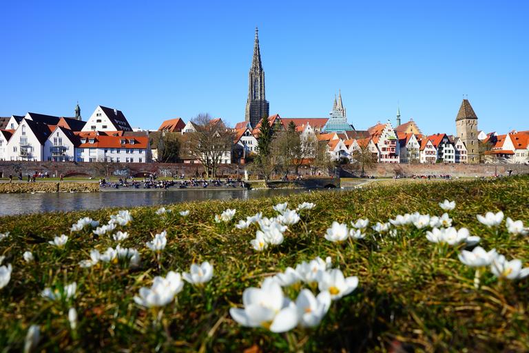 Keywords: ulm new ulm view outlook city wall downtown center city view ulm cathedral münster building dom city tower steeple church architecture cathedral old town places of interest metzgerturm spring meadow crocus flowers white
