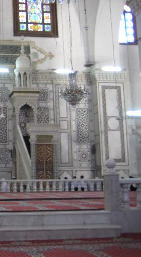 | Keywords: UmayyadMosque05PulpitSajjadBibiArea.jpg  en Umayyad Mosque - White pulpit mimbar where Imam Ali Zaynul Abideen gave his sermon to the court of Yazid Raised portion in front of it where the ladies and children stood in the court Own Toushiro Aug/08 Inside the Umayyad Mosque |
