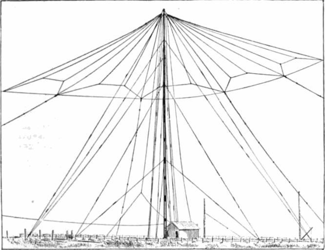 | Keywords: Umbrella antenna 1910.png umbrella antenna a monopole antenna used for LF transmitting at the longwave wireless telegraphy station of the Amalgamated Radiotelegraphic Co at Cullarcoats on the Northumberland coast near Newcastle England in 1910 It consists of a 220 ft wooden lattice tower with two wires running from the transmitter in the building to the top connected at the top to 24 bronze wires extending radially from the mast on a diagonal attached to ropes which are anchored to the ground on a circle 220 ft in radius The vertical wires served as an electrically short quarter-wave monopole antenna while the radial wires served as a capacitive top hat to increase the current in the vertical radiators The other side of the transmitter was connected to a ground Earth system consisting of buried cables radiating from the base of the mast It transmitted with both a spark gap transmitter and a Poulsen arc transmitter on a frequency of 200 kHz 1910 Retrieved February 17 2015 from https //books google com/books id qQFVAAAAMAAJ pg PA797 John Ambrose Fleming 1910 The Principles of Electric Wave Telegraphy and Telephony 2nd Ed Longmans Green and Co New York p 797 fig 16 on Google Books John Ambrose Fleming Fleming died in 1945 other versions PD-old-70-1923 Wire antenna Uploaded with UploadWizard |