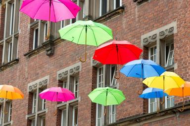 Keywords: umbrellas home wall many colorful red green blue yellow fly sky top high depend series lined up quantitative color sun sunny rain fabric building city on the go out festival festivity event eye catcher stand out pink town festival