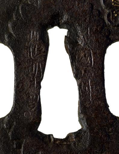 | Keywords: Umetada Myôju - Tsuba with Gingko Leaf, Plum Blossom and Chrysanthemum - Walters 51408 - Mark A.jpg On the front of this tsuba a plum blossom decorates the upper right At the bottom is a gingko leaf A chrysanthemum flower surrounds the central opening for the sword blade On the reverse is the branch of a Japanese pepper tree with sanshô nuts between 1558 1631 Momoyama; early Edo iron gold cm 6 9 accession number 51 408 36535 Henry Walters Baltimore date and mode of acquisition unknown Walters Art Museum Henry Walters Acquired by Henry Walters Signature Yamashiro no kuni Nishijin jû/Umetada Myôju saku kao ; Translation Living in Nishijin Yamashiro province/ Made by Umetada Myôju place of origin Kyoto Nishijin Japan Walters Art Museum license Tosogu Japanese sword fittings in the Walters Art Museum Umetada Myôju Media contributed by the Walters Art Museum needs category review |