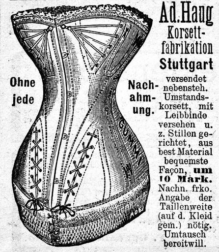 | Keywords: UmstandsKorsett.jpg en Advertising for an pregnancy- maternity- corset de Reklame für ein Schwangerschafts- Umstands- Korsett Werbetext Ad Hang Korsett- fabrikation Stuttgart versendet nebensteh Umstands- Korsett mit Leibbinde versehen u z Stillen gerichtet aus best Material bequemste Facon um 10 Mark Nachn frko Angabe der Taillenweite auf d Kleid gem nötig Umtausch bereitwill Ohne jede Nachahmung Fürs Haus Praktisches Wochenblatt für alle Hausfrauen 21 07 1889 Clara von Studnitz Ad Hang Korsettfabrikation Stuttgart 1889-07-18 Corset advertisements Maternity corsets 1889 advertisements Fashion in 1889 Pregnancy in art Corsets in 1880s fashion PD-old |