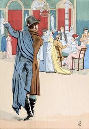 Keywords: Un salon de Frascati, Paris, 1800.jpg Artwork This plate depicts a group of people at Frascati's The man in the foreground is plainly dressed in dark colors while pastels are favored by the women Frascati's was a cafe in Paris described by the text as 'A stream of human beauty' as the expression of the period has it was still to be seen flowing through the galleries of Greek and Roman antiquities spreading through the porticos into the saloons and smaller chambers pouring and winding along the garden alleys and disappearing at last into the kiosks where it was lost to sight The great mirror at the end of the garden reflected as in a wonderful prismatic vision the surging crowd of veiled or turbaned heads of ever-changing couples each whispering and fondly clasped; while farther off seated at tables in the open air thirsty nymphs called for creams and tutti frutti and all the various iced compounds then so eagerly consumed 1898 colored plate 10 x 15 cm Institution Brown University Library object history exhibition history credit line Published in Octave Uzanne Fashion in Paris the various phases of feminine taste and aesthetics from 1797 to 1897 London William Heinemann 1898 accession number 1145807997499275 PD-old Les modes de Paris 014 Images of Paris from the Brown University Library 1800 in Paris Fashion in 1800 Café Frascati Paris