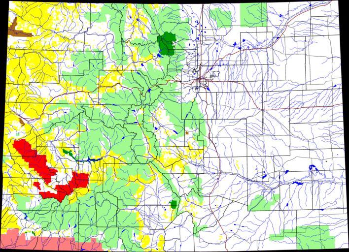 | Keywords: Uncompahgre National Forest location in Colorado.png Uncompahgre National Forest highlighted in red The light green is other Forest Service land yellow is BLM land dark green is National Park brown is National Monument or National Historic Site pink is Indian reservation The reddish lines are Interstate Highways David Benbennick made this map with data from http //nationalatlas gov nationalatlas gov The map uses the azimuthal equidistant projection centered on -105 7167 39 1333 degrees latitude longitude The area outside Colorado is transparent so it should look nice on non-white backgrounds Eventually I will upload the 4 megabyte Metapost script I used to make this map In the mean time see http //www cam cornell edu/~dbenbenn/nationalatlas/Colorado_national_forests/map mp map mp own David Benbennick other versions Colorado national forest maps Uncompahgre National Forest Metapost diagrams |