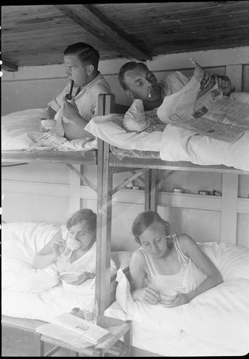 | Keywords: reading bunk beds bunkbeds camp cabin newspaper pipe drinking smoking cofee sven türck sventürck b&w bw blackandwhite monochrome black and white Young people on a camp stay KB id: turck_23015 Photo: Sven Türck (1897-1954) Department of Maps, Prints and Photographs, The Royal Library, Denmark. Young people on a camp stay KB id: turck_23015 Photo: Sven Türck (1897-1954) Department of Maps, Prints and Photographs, The Royal Library, Denmark. | ||||