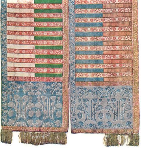 | Keywords: Unger manufacture Kontusz sash.jpg Kontusz sash four sided Pas kontuszowy czterostronny Aleksander Unger manufacture in KobyĆka century 18 silk gold thread cm 48 340 Tadeusz MaĆkowski 1937 Pasy polskie Polish Sashes Arkady Signed FAB/RYK KOB/YĆKI Owned by National Museum in Warsaw lost 1939 PD-Art PD-Art Kontusz sashes Textiles lost in Poland during World War II Missing items from the National Museum in Warsaw | ||||