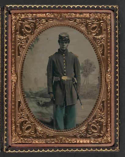 Keywords: library of congress libraryofcongress dc:identifier=http://hdl.loc.gov/loc.pnp/ppmsca.26988 dc:identifier=httphdllocgovlocpnpppmsca26988 xmlns:dc=http://purl.org/dc/elements/1.1/ xmlns:dc=httppurlorgdcelements11 photo border picture frame [Unidentified African American soldier in Union uniform and Company B, 103rd Regiment forage cap with bayonet and scabbard in front of painted backdrop showing landscape with river] [between 1863 and 1865] 1 photograph : quarter-plate tintype, hand-colored ; 12 x 9.5 cm (case) Notes: Title devised by Library staff. Case: Leather floral motif. Photograph shows Company B 103 Regiment on forage cap either designating the U.S. Colored Troops or U.S. Volunteers Service. Gift; Tom Liljenquist; 2010; (DLC/PP-2010:105). Purchased from: The Horse Soldier, Cashtown, Pa., 2003. Subjects: United States.--Army--People--1860-1870. African Americans--Military service--1860-1870. Soldiers--Union--1860-1870. Military uniforms--Union--1860-1870. Bayonets--1860-1870. Backdrops--1860-1870. United States--History--Civil War, 1861-1865--Military personnel--Union. Format: Portrait photographs--1860-1870. Tintypes--Hand-colored--1860-1870. Rights Info: No known restrictions on publication. Repository: Library of Congress, Prints and Photographs Division, Washington, D.C. 20540 USA, hdl.loc.gov/loc.pnp/pp.print Part Of: Ambrotype/Tintype filing series (Library of Congress) (DLC) 2010650518 Liljenquist Family collection (Library of Congress) (DLC) 2010650519 More information about this collection is available at hdl.loc.gov/loc.pnp/pp.lilj Persistent URL: hdl.loc.gov/loc.pnp/ppmsca.26988 Call Number: AMB/TIN no. 2135 [Unidentified African American soldier in Union uniform and Company B, 103rd Regiment forage cap with bayonet and scabbard in front of painted backdrop showing landscape with river] [between 1863 and 1865] 1 photograph : quarter-plate tintype, hand-colored ; 12 x 9.5 cm (case) Notes: Title devised by Library staff. Case: Leather floral motif. Photograph shows Company B 103 Regiment on forage cap either designating the U.S. Colored Troops or U.S. Volunteers Service. Gift; Tom Liljenquist; 2010; (DLC/PP-2010:105). Purchased from: The Horse Soldier, Cashtown, Pa., 2003. Subjects: United States.--Army--People--1860-1870. African Americans--Military service--1860-1870. Soldiers--Union--1860-1870. Military uniforms--Union--1860-1870. Bayonets--1860-1870. Backdrops--1860-1870. United States--History--Civil War, 1861-1865--Military personnel--Union. Format: Portrait photographs--1860-1870. Tintypes--Hand-colored--1860-1870. Rights Info: No known restrictions on publication. Repository: Library of Congress, Prints and Photographs Division, Washington, D.C. 20540 USA, hdl.loc.gov/loc.pnp/pp.print Part Of: Ambrotype/Tintype filing series (Library of Congress) (DLC) 2010650518 Liljenquist Family collection (Library of Congress) (DLC) 2010650519 More information about this collection is available at hdl.loc.gov/loc.pnp/pp.lilj Persistent URL: hdl.loc.gov/loc.pnp/ppmsca.26988 Call Number: AMB/TIN no. 2135