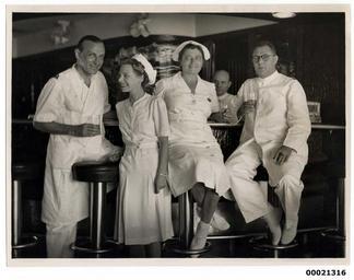 | Keywords: samuel j hood collection samueljhoodcollection hood collection hoodcollection dutch tss oranje ii tssoranjeii oranje hospital ship hospitalship world war ii worldwarii wwii nurses medical personnel medicalpersonnel war robert menzies robertmenzies red cross redcross dutch netherlands indies government dutchnetherlandsindiesgovernment major-general hein ter poorten majorgeneralheinterpoorten poorten cockatoo island cockatooisland cockatoo island dockyards cockatooislanddockyards groupshot people photo border This photograph depicts unidentified medical personnel on board TSS ORANJE II drinking at a bar. On 28 June 1941, after a refitting at Cockatoo dock, Australia's Prime Minister Robert Menzies hoisted a Red Cross flag on the Dutch liner TSS ORANJE. The ceremony marked the handing over of the vessel from the Dutch Netherlands Indies Government to the Australian and New Zealand Governments to be used as a hospital ship. This photo is part of the Australian National Maritime Museum’s Samuel J. Hood Studio collection. Sam Hood (1872-1953) was a Sydney photographer with a passion for ships. His 60-year career spanned the romantic age of sail and two world wars. The photos in the collection were taken mainly in Sydney and Newcastle during the first half of the 20th century. The ANMM undertakes research and accepts public comments that enhance the information we hold about images in our collection. This record has been updated accordingly. Photographer: Samuel J. Hood Studio Collection Object no. 00021316 This photograph depicts unidentified medical personnel on board TSS ORANJE II drinking at a bar. On 28 June 1941, after a refitting at Cockatoo dock, Australia's Prime Minister Robert Menzies hoisted a Red Cross flag on the Dutch liner TSS ORANJE. The ceremony marked the handing over of the vessel from the Dutch Netherlands Indies Government to the Australian and New Zealand Governments to be used as a hospital ship. This photo is part of the Australian National Maritime Museum’s Samuel J. Hood Studio collection. Sam Hood (1872-1953) was a Sydney photographer with a passion for ships. His 60-year career spanned the romantic age of sail and two world wars. The photos in the collection were taken mainly in Sydney and Newcastle during the first half of the 20th century. The ANMM undertakes research and accepts public comments that enhance the information we hold about images in our collection. This record has been updated accordingly. Photographer: Samuel J. Hood Studio Collection Object no. 00021316 |
