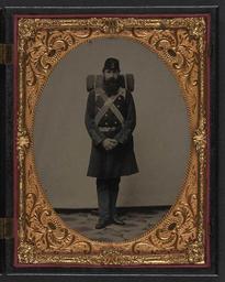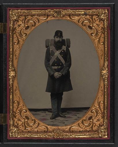 | Keywords: library of congress libraryofcongress dc:identifier=http://hdl.loc.gov/loc.pnp/ppmsca.27539 dc:identifier=httphdllocgovlocpnpppmsca27539 xmlns:dc=http://purl.org/dc/elements/1.1/ xmlns:dc=httppurlorgdcelements11 picture frame photo border [Unidentified soldier in Union frock coat and Company C, 71st Regiment forage cap with knapsack and bedroll] [between 1861 and 1865] 1 photograph : half-plate ambrotype, hand-colored ; 15.6 x 12.5 cm (case) Notes: Title devised by Library staff. Case: Berg, no. 1-12. Photograph shows headstand. Gift; Tom Liljenquist; 2010; (DLC/PP-2010:105). Purchased from: Jerry Greenstein, Weapons and Militaria. Subjects: United States.--Army--People--1860-1870. Soldiers--Union--1860-1870. Military uniforms--Union--1860-1870. United States--History--Civil War, 1861-1865--Military personnel--Union. Format: Portrait photographs--1860-1870. Ambrotypes--Hand-colored--1860-1870. Rights Info: No known restrictions on publication. Repository: Library of Congress, Prints and Photographs Division, Washington, D.C. 20540 USA, hdl.loc.gov/loc.pnp/pp.print Part Of: Ambrotype/Tintype filing series (Library of Congress) (DLC) 2010650518 Liljenquist Family collection (Library of Congress) (DLC) 2010650519 More information about this collection is available at hdl.loc.gov/loc.pnp/pp.lilj Persistent URL: hdl.loc.gov/loc.pnp/ppmsca.27539 Call Number: AMB/TIN no. 5032 [Unidentified soldier in Union frock coat and Company C, 71st Regiment forage cap with knapsack and bedroll] [between 1861 and 1865] 1 photograph : half-plate ambrotype, hand-colored ; 15.6 x 12.5 cm (case) Notes: Title devised by Library staff. Case: Berg, no. 1-12. Photograph shows headstand. Gift; Tom Liljenquist; 2010; (DLC/PP-2010:105). Purchased from: Jerry Greenstein, Weapons and Militaria. Subjects: United States.--Army--People--1860-1870. Soldiers--Union--1860-1870. Military uniforms--Union--1860-1870. United States--History--Civil War, 1861-1865--Military personnel--Union. Format: Portrait photographs--1860-1870. Ambrotypes--Hand-colored--1860-1870. Rights Info: No known restrictions on publication. Repository: Library of Congress, Prints and Photographs Division, Washington, D.C. 20540 USA, hdl.loc.gov/loc.pnp/pp.print Part Of: Ambrotype/Tintype filing series (Library of Congress) (DLC) 2010650518 Liljenquist Family collection (Library of Congress) (DLC) 2010650519 More information about this collection is available at hdl.loc.gov/loc.pnp/pp.lilj Persistent URL: hdl.loc.gov/loc.pnp/ppmsca.27539 Call Number: AMB/TIN no. 5032 |