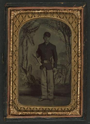Keywords: library of congress libraryofcongress dc:identifier=http://hdl.loc.gov/loc.pnp/ppmsca.27415 dc:identifier=httphdllocgovlocpnpppmsca27415 xmlns:dc=http://purl.org/dc/elements/1.1/ xmlns:dc=httppurlorgdcelements11 picture frame photo border [Unidentified young soldier in Union uniform and infantry forage cap with sheathed musicans' sword and bugle in front of painted backdrop showing palm trees] [between 1861 and 1865] 1 photograph : carte de visite-plate tintype, hand-colored ; 10.7 x 7.5 cm (case) Notes: Title devised by Library staff. Case: Leather cross and scroll design Gift; Tom Liljenquist; 2010; (DLC/PP-2010:105). Subjects: United States.--Army.--People--1860-1870. Soldiers--Union--1860-1870. Military uniforms--Union--1860-1870. United States--History--Civil War, 1861-1865--Military personnel--Union. Format: Portrait photographs--1860-1870. Tintypes--Hand-colored--1860-1870. Rights Info: No known restrictions on publication. Repository: Library of Congress, Prints and Photographs Division, Washington, D.C. 20540 USA, hdl.loc.gov/loc.pnp/pp.print Part Of: Ambrotype/Tintype filing series (Library of Congress) (DLC) 2010650518 Liljenquist Family collection (Library of Congress) (DLC) 2010650519 More information about this collection is available at hdl.loc.gov/loc.pnp/pp.lilj Persistent URL: hdl.loc.gov/loc.pnp/ppmsca.27415 Call Number: AMB/TIN no. 2550 [Unidentified young soldier in Union uniform and infantry forage cap with sheathed musicans' sword and bugle in front of painted backdrop showing palm trees] [between 1861 and 1865] 1 photograph : carte de visite-plate tintype, hand-colored ; 10.7 x 7.5 cm (case) Notes: Title devised by Library staff. Case: Leather cross and scroll design Gift; Tom Liljenquist; 2010; (DLC/PP-2010:105). Subjects: United States.--Army.--People--1860-1870. Soldiers--Union--1860-1870. Military uniforms--Union--1860-1870. United States--History--Civil War, 1861-1865--Military personnel--Union. Format: Portrait photographs--1860-1870. Tintypes--Hand-colored--1860-1870. Rights Info: No known restrictions on publication. Repository: Library of Congress, Prints and Photographs Division, Washington, D.C. 20540 USA, hdl.loc.gov/loc.pnp/pp.print Part Of: Ambrotype/Tintype filing series (Library of Congress) (DLC) 2010650518 Liljenquist Family collection (Library of Congress) (DLC) 2010650519 More information about this collection is available at hdl.loc.gov/loc.pnp/pp.lilj Persistent URL: hdl.loc.gov/loc.pnp/ppmsca.27415 Call Number: AMB/TIN no. 2550