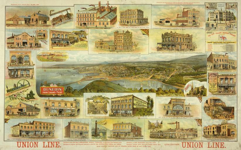 Keywords: text Shows a view of Dunedin from Logan's Point in the centre. Surrounding it from top left (clockwise) are: James Macfie & Co City Coal Depot; James Duthie & Co's Colonial Carrying Company of New Zealand, J & J Arthur (tailors); A & T Burt (engineers); Thomson & Co. Crystal Springs Mineral Water Works; H E Shacklock (ironfounder and engineer); Joseph Mackay City Boot Palace; St Domonic's Convent and High School; W Melville's Cyclists' Exchange and Sewing Machine Depot; Andrew Lees (glass importer); J W Faulkner & Sons (Ornamnetal iron and wire works); John Gillies Wholesale and retail Cabinetmaker and upholsterer, and undertaker; Findlay and Murdoch City Sawmills; Paterson & Barr (hardware importers); Duthie Brothers General Drapers; F A Hooper & Co (Furnishing Warehouse); W D Houston (Gentlemen's mercer); Joseph Braithwaite (Book and Stationery importer); New Zealand Engineering and Electrical Company (Thomas Stevenson, R H Postlethwaite); Edward Iles (Hairdresser, Wigmaker). Inscriptions: Inscribed - Recto - top right: Printed for the proprietors of the "Evening Star" Dunedin, by F W Niven & Co., and published by John George Moody, Mornington.. Quantity: 1 colour art print(s). Physical Description: Lithograph, coloured, 637 x 1010 mm. Provenance: Acquired in 1980. Union Steam Ship Company of New Zealand Ltd. Union Steam Ship Company of New Zealand :Dunedin from Logan's Point [and views of Dunedin buildings]. Supplement of the "Dunedin Star", May 15th, 1893.. Ref: Eph-E-BUILDINGS-Dunedin-1893-02. Alexander Turnbull Library, Wellington, New Zealand. natlib.govt.nz/records/22481862 Shows a view of Dunedin from Logan's Point in the centre. Surrounding it from top left (clockwise) are: James Macfie & Co City Coal Depot; James Duthie & Co's Colonial Carrying Company of New Zealand, J & J Arthur (tailors); A & T Burt (engineers); Thomson & Co. Crystal Springs Mineral Water Works; H E Shacklock (ironfounder and engineer); Joseph Mackay City Boot Palace; St Domonic's Convent and High School; W Melville's Cyclists' Exchange and Sewing Machine Depot; Andrew Lees (glass importer); J W Faulkner & Sons (Ornamnetal iron and wire works); John Gillies Wholesale and retail Cabinetmaker and upholsterer, and undertaker; Findlay and Murdoch City Sawmills; Paterson & Barr (hardware importers); Duthie Brothers General Drapers; F A Hooper & Co (Furnishing Warehouse); W D Houston (Gentlemen's mercer); Joseph Braithwaite (Book and Stationery importer); New Zealand Engineering and Electrical Company (Thomas Stevenson, R H Postlethwaite); Edward Iles (Hairdresser, Wigmaker). Inscriptions: Inscribed - Recto - top right: Printed for the proprietors of the "Evening Star" Dunedin, by F W Niven & Co., and published by John George Moody, Mornington.. Quantity: 1 colour art print(s). Physical Description: Lithograph, coloured, 637 x 1010 mm. Provenance: Acquired in 1980. Union Steam Ship Company of New Zealand Ltd. Union Steam Ship Company of New Zealand :Dunedin from Logan's Point [and views of Dunedin buildings]. Supplement of the "Dunedin Star", May 15th, 1893.. Ref: Eph-E-BUILDINGS-Dunedin-1893-02. Alexander Turnbull Library, Wellington, New Zealand. natlib.govt.nz/records/22481862 |