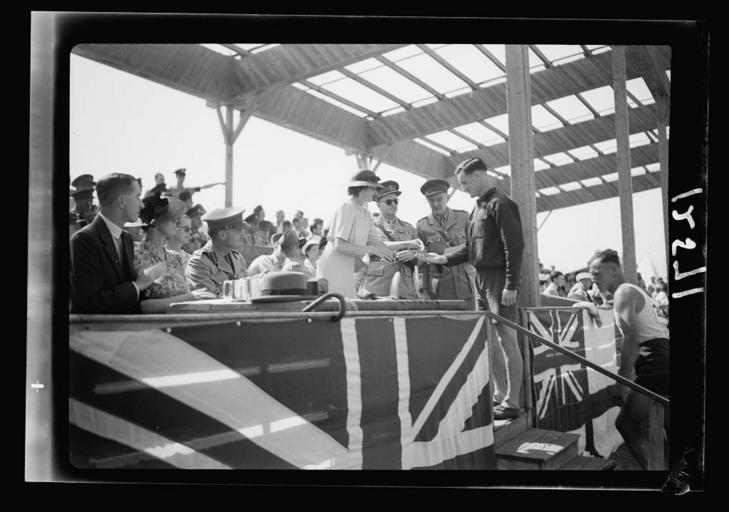 | Keywords: United Services Athletic meeting at Tel Aviv Maccabiah Stadium on Sat. May 2, 1942. J.F. (i.e., J.V.) Powell receiving prize from Major General.jpg en United Services Athletic meeting at Tel Aviv Maccabiah Stadium on Sat May 2 1942 J F i e J V Powell receiving prize from Major General 1942-05-02 LOC-image matpc 21249 http //www loc gov/pictures/related/ fi name q Matson 20Photo 20Service Matson Photo Service photographer Custom license marker 2014 02 18 PD-Matson Uploaded with UploadWizard Maccabiah Stadium |