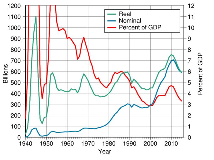 | Keywords: United States military spending.svg translate yes en United States military spending from 1940 to 2015 in nominal dollars 2015 dollars and as a percent of GDP During World War II spending reached 37 of GDP in 1944 and during the Korean War reached 13 8 in 1953 Data source https //www whitehouse gov/omb/budget/Historicals Historical tables Table 6 1 2016-05-18 own Delphi234 other versions current annually Generated with Wikimedia SVG Chart SVG Chart/box cc-zero Military of the United States budget |