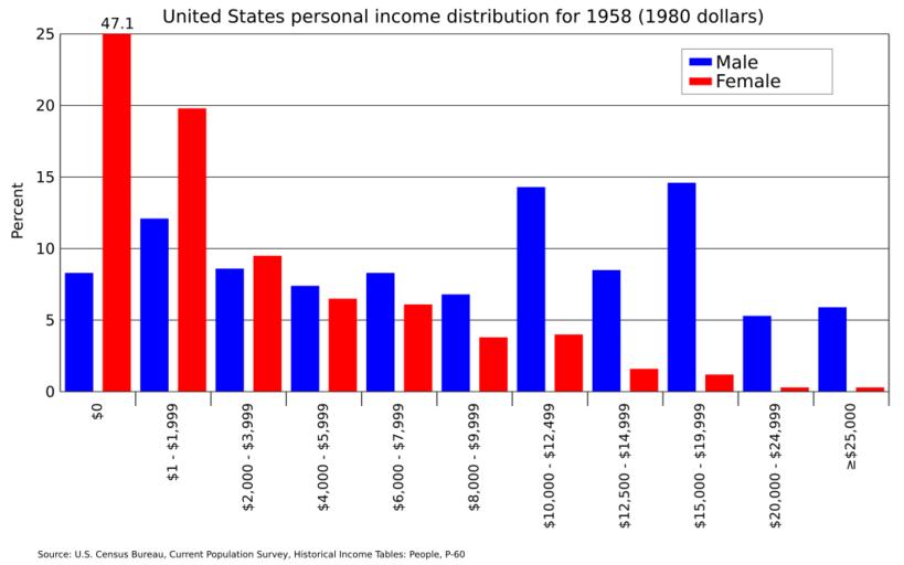 | Keywords: United States personal income by sex in 1980 dollars-1958.svg translate yes en Distribution of personal income by sex in the United States in 1958 in 1980 dollars Source U S Census Bureau Current Population Survey Historical Income People https //www2 census gov/prod2/popscan/p60-132 pdf P-60 Table 44 pgs 138-140 2016-05-05 own Delphi234 other versions Note wikitable - 1980 dollars 2014 dollars - 2 000 5 746 - 4 000 11 492 - 6 000 17 238 - 8 000 22 984 - 10 000 28 730 - 12 500 35 913 - 15 000 43 095 - 20 000 57 460 - 25 000 71 825 cc-zero Income distribution in the United States Personal income in the United States |