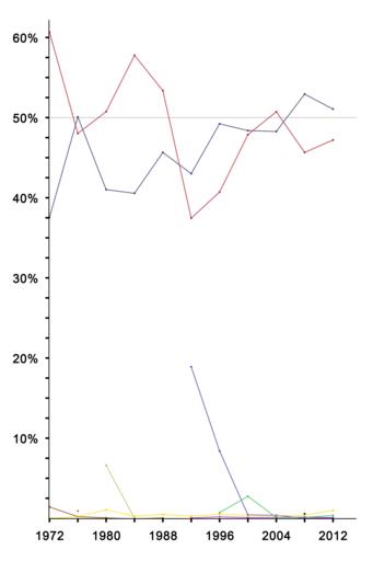 | Keywords: United States presidential election results line graph (Expanded).png Key FFD900 Libertarian Party 1px AAAAAA solid 3C3B6E Democratic Party 1px AAAAAA solid B22234 Republican Party 1px AAAAAA solid 884200 American Independent Party 1px AAAAAA solid 827C1D Eugene J McCarthy 1px AAAAAA solid BDB159 National Unity Party John B Anderson 1px AAAAAA solid 6B47AA Ross Perot/Reform Party of the United States of America 1px AAAAAA solid AB37C8 Constitution Party United States 1px AAAAAA solid 27C851 Greens/Green Party USA/Green Party of the United States 1px AAAAAA solid 000000 Ralph Nader other 1px AAAAAA solid Notes <p>Although John B Anderson ultimately declined to run in 1984 the National Unity Party of Kentucky nevertheless placed him on the ballot <p>Although Ross Perot had not yet formed the Reform Party of the United States of America in 1992 his 1992 run is nevertheless displayed above as a Reform Party run <p>Although the Libertarian Party was on the ballot in all fifty United States plus D C in 2000 the Libertarian Party of Arizona due to a conflict with the national party opted to place L Neil Smith on the ballot in place of the national party's nominee Harry Browne The 5 775 votes received by Smith are included in the party's 2000 total <p>The Green Party that nominated candidates for the presidency in 1996 and 2000 was the Greens/Green Party USA The Green Party that nominated candidates for the presidency ever since has been the Green Party of the United States <p>Although Ron Paul did not run in the general elections of 2008 or 2012 supporters nevertheless got his name on the ballot in some states and got him write-in access in others Ron Paul was also the Libertarian Party nominee in 1988 alexpeak com 22 March 2016 allixpeeke 200px Bar graph 350px Expanded bar graph 175px Line graph Cc-zero Category American Independent Party presidential graphs United States presidential election statistics United States presidential election 1972 United States presidential election 1976 United States presidential election 1980 United States presidential election 1984 United States presidential election 1988 United States presidential election 1992 United States presidential election 1996 United States presidential election 2000 United States presidential election 2004 United States presidential election 2008 Libertarian Party presidential graphs United States Libertarian Party 1972 presidential campaign United States Libertarian Party 1976 presidential campaign United States Libertarian Party 1980 presidential campaign United States Libertarian Party 1984 presidential campaign United States Libertarian Party 1988 presidential campaign United States Libertarian Party 1992 presidential campaign United States Libertarian Party 1996 presidential campaign United States Libertarian Party 2000 presidential campaign United States Libertarian Party 2004 presidential campaign United States Libertarian Party 2008 presidential campaign United States Libertarian Party 2012 presidential campaign United States Democratic Party presidential graphs United States United States Democratic Party 1972 presidential campaign United States Democratic Party 1976 presidential campaign United States Democratic Party 1980 presidential campaign United States Democratic Party 1984 presidential campaign United States Democratic Party 1988 presidential campaign United States Democratic Party 1992 presidential campaign United States Democratic Party 1996 presidential campaign Al Gore presidential campaign 2000 United States Democratic Party 2004 presidential campaign United States Democratic Party 2008 presidential campaign United States Democratic Party 2012 presidential campaign Republican Party presidential graphs United States United States Republican Party 1972 presidential campaign United States Republican Party 1976 presidential campaign United States Republican Party 1980 presidential campaign United States Republican Party 1984 presidential campaign United States Republican Party 1988 presidential campaign United States Republican Party 1992 presidential campaign United States Republican Party 1996 presidential campaign George W Bush presidential campaign 2000 George W Bush presidential campaign 2004 United States Republican Party 2008 presidential campaign United States Republican Party 2012 presidential campaign Green Party of the United States presidential graphs Greens/Green Party USA 1996 presidential campaign Greens/Green Party USA 2000 presidential campaign Green Party of the United States 2004 presidential campaign Green Party of the United States 2008 presidential campaign Green Party of the United States 2012 presidential campaign Constitution Party presidential graphs United States U S Taxpayers Party 1992 presidential campaign U S Taxpayers Party 1996 presidential campaign Constitution Party 2000 presidential campaign United States Constitution Party 2004 presidential campaign United States Constitution Party 2008 presidential campaign United States Constitution Party 2012 presidential campaign United States Ralph Nader graphs Ralph Nader presidential campaign 2008 Reform Party of the United States of America presidential graphs Ross Perot presidential campaign 1992 Reform Party of the United States of America 1996 presidential campaign Reform Party of the United States of America 2000 presidential campaign Reform Party of the United States of America 2004 presidential campaign Reform Party of the United States of America 2008 presidential campaign Reform Party of the United States of America 2012 presidential campaign National Unity Party presidential graphs United States Eugene McCarthy presidential graphs Political line charts Electoral timelines of the United States of America Dot charts Gary Johnson graphs |