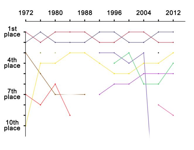 | Keywords: United States presidential election ordinal results line graph (Expanded).png Key FFD900 Libertarian Party 1px AAAAAA solid 3C3B6E Democratic Party 1px AAAAAA solid B22234 Republican Party 1px AAAAAA solid FF0000 Communist Party USA 1px AAAAAA solid 884200 American Independent Party 1px AAAAAA solid 827C1D Eugene J McCarthy 1px AAAAAA solid BDB159 National Unity Party John B Anderson 1px AAAAAA solid 6B47AA Ross Perot/Reform Party of the United States of America 1px AAAAAA solid AB37C8 Constitution Party United States 1px AAAAAA solid 27C851 Greens/Green Party USA/Green Party of the United States 1px AAAAAA solid 000000 Ralph Nader other 1px AAAAAA solid F13A8D Ron Paul other 1px AAAAAA solid Notes <p>Although Ross Perot had not yet formed the Reform Party of the United States of America in 1992 his 1992 run is nevertheless displayed above as a Reform Party run <p>The Green Party that nominated candidates for the presidency in 1996 and 2000 was the Greens/Green Party USA The Green Party that nominated candidates for the presidency ever since has been the Green Party of the United States <p>The graph does not note it but although George W Bush received more electoral votes than Al Gore in 2000 the latter received more raw votes <p>Although Ron Paul did not run in the general elections of 2008 or 2012 supporters nevertheless got his name on the ballot in some states and got him write-in access in others Ron Paul was also the Libertarian Party nominee in 1988 alexpeak com 22 March 2016 allixpeeke 200px Bar graph 350px Expanded bar graph 175px Line graph Cc-zero United States presidential election statistics United States presidential election 1972 United States presidential election 1976 United States presidential election 1980 United States presidential election 1984 United States presidential election 1988 United States presidential election 1992 United States presidential election 1996 United States presidential election 2000 United States presidential election 2004 United States presidential election 2008 Libertarian Party presidential graphs United States Libertarian Party 1972 presidential campaign United States Libertarian Party 1976 presidential campaign United States Libertarian Party 1980 presidential campaign United States Libertarian Party 1984 presidential campaign United States Libertarian Party 1988 presidential campaign United States Libertarian Party 1992 presidential campaign United States Libertarian Party 1996 presidential campaign United States Libertarian Party 2000 presidential campaign United States Libertarian Party 2004 presidential campaign United States Libertarian Party 2008 presidential campaign United States Libertarian Party 2012 presidential campaign United States Democratic Party presidential graphs United States United States Democratic Party 1972 presidential campaign United States Democratic Party 1976 presidential campaign United States Democratic Party 1980 presidential campaign United States Democratic Party 1984 presidential campaign United States Democratic Party 1988 presidential campaign United States Democratic Party 1992 presidential campaign United States Democratic Party 1996 presidential campaign Al Gore presidential campaign 2000 United States Democratic Party 2004 presidential campaign United States Democratic Party 2008 presidential campaign United States Democratic Party 2012 presidential campaign Republican Party presidential graphs United States United States Republican Party 1972 presidential campaign United States Republican Party 1976 presidential campaign United States Republican Party 1980 presidential campaign United States Republican Party 1984 presidential campaign United States Republican Party 1988 presidential campaign United States Republican Party 1992 presidential campaign United States Republican Party 1996 presidential campaign George W Bush presidential campaign 2000 George W Bush presidential campaign 2004 United States Republican Party 2008 presidential campaign United States Republican Party 2012 presidential campaign Green Party of the United States presidential graphs Greens/Green Party USA 1996 presidential campaign Greens/Green Party USA 2000 presidential campaign Green Party of the United States 2004 presidential campaign Green Party of the United States 2008 presidential campaign Green Party of the United States 2012 presidential campaign Constitution Party presidential graphs United States U S Taxpayers Party 1992 presidential campaign U S Taxpayers Party 1996 presidential campaign Constitution Party 2000 presidential campaign United States Constitution Party 2004 presidential campaign United States Constitution Party 2008 presidential campaign United States Constitution Party 2012 presidential campaign United States Ron Paul graphs Ron Paul presidential campaign 2008 Ron Paul presidential campaign 2012 Ralph Nader presidential campaign 2008 Reform Party of the United States of America presidential graphs Ross Perot presidential campaign 1992 Reform Party of the United States of America 1996 presidential campaign Reform Party of the United States of America 2000 presidential campaign Reform Party of the United States of America 2004 presidential campaign Reform Party of the United States of America 2008 presidential campaign American Independent Party presidential graphs Communist Party USA presidential graphs National Unity Party presidential graphs United States Eugene McCarthy presidential graphs Political line charts Charts in English Electoral timelines of the United States of America Dot charts Gary Johnson graphs |