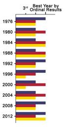 | Keywords: United States presidential ordinal interyear intraparty results comparison of ordinal results bar graph.png Key FFD900 Libertarian Party 1px AAAAAA solid 3C3B6E Democratic Party 1px AAAAAA solid B22234 Republican Party 1px AAAAAA solid Notes <p>This graph ordinally charts the various prominent United States of America national parties' various presidential rankings since 1976 in relation to one another as opposed to charting their various presidential rankings in relation to the other United States of America national parties' various presidential rankings For example using this graph one can see that the Libertarian Party had its highest ranking since 1976 in the years 1984 1988 and 2012 it came in third place in those three years or that the Republican Party had its second-highest ranking since 1976 in the years 1976 1992 1996 2008 and 2012 it came in second place in those five years <p>Although this graph compares intraparty ordinal rankings based on percentages of the popular votes the graph deviates from this in that it indicates the Republican Party's 2000 electoral victory over the Democratic Party alexpeak com 22 March 2016 allixpeeke 100px Expanded bar graph Cc-zero United States presidential election statistics United States presidential election 1976 United States presidential election 1980 United States presidential election 1984 United States presidential election 1988 United States presidential election 1992 United States presidential election 1996 United States presidential election 2000 United States presidential election 2004 United States presidential election 2008 Libertarian Party presidential graphs United States Libertarian Party 1976 presidential campaign United States Libertarian Party 1980 presidential campaign United States Libertarian Party 1984 presidential campaign United States Libertarian Party 1988 presidential campaign United States Libertarian Party 1992 presidential campaign United States Libertarian Party 1996 presidential campaign United States Libertarian Party 2000 presidential campaign United States Libertarian Party 2004 presidential campaign United States Libertarian Party 2008 presidential campaign United States Libertarian Party 2012 presidential campaign United States Democratic Party presidential graphs United States United States Democratic Party 1976 presidential campaign United States Democratic Party 1980 presidential campaign United States Democratic Party 1984 presidential campaign United States Democratic Party 1988 presidential campaign United States Democratic Party 1992 presidential campaign United States Democratic Party 1996 presidential campaign Al Gore presidential campaign 2000 United States Democratic Party 2004 presidential campaign United States Democratic Party 2008 presidential campaign United States Democratic Party 2012 presidential campaign Republican Party presidential graphs United States United States Republican Party 1976 presidential campaign United States Republican Party 1980 presidential campaign United States Republican Party 1984 presidential campaign United States Republican Party 1988 presidential campaign United States Republican Party 1992 presidential campaign United States Republican Party 1996 presidential campaign George W Bush presidential campaign 2000 George W Bush presidential campaign 2004 United States Republican Party 2008 presidential campaign United States Republican Party 2012 presidential campaign Political bar charts Charts in English Electoral timelines of the United States of America Gary Johnson graphs |