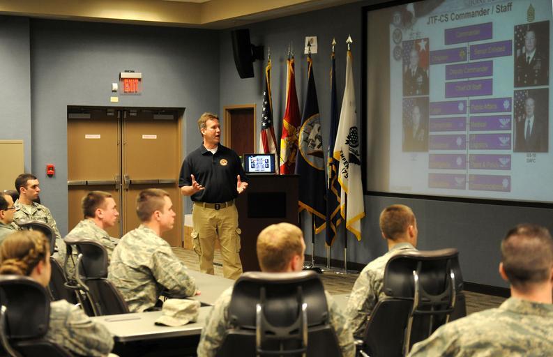 Keywords: University of Tennessee Air Force ROTC cadets recieve Joint Task Force Civil Support mission brief 140320-N-VJ282-383.jpg en Rick George joint communication control center chief Joint Task Force Civil Support discusses the unit mission to University of Tennessee Air Force Reserve Officer Training Corps cadets during their visit here March 20 2014 More than 20 cadets received a mission brief and took a tour of the headquarters building as part of their spring 2014 Hampton Roads military base tour JTF-CS anticipates plans and prepares for chemical biological radiological and nuclear defense support of civil authority CBRN-DSCA response operations When directed JTF-CS deploys to command and control DOD forces in support of civil authority response operations in order to save lives prevent further injury and provide temporary critical support to enable community recovery Official DOD photo by U S Navy Petty Officer 1st Class Brian Dietrick 2014-03-20 Petty Officer 1st Class Brian Dietrick https //www dvidshub net/image/1192221 140320-N-VJ282-383 2014-03-21 07 37 FORT EUSTIS VA US PD-USGov-Military-Navy Fort Eustis Images from DoD uploaded by Fæ University of Tennessee Air Force ROTC cadets receive Joint Task Force Civil Support mission brief 140320-N-VJ282-383.jpg en Rick George joint communication control center chief Joint Task Force Civil Support discusses the unit mission to University of Tennessee Air Force Reserve Officer Training Corps cadets during their visit here March 20 2014 More than 20 cadets received a mission brief and took a tour of the headquarters building as part of their spring 2014 Hampton Roads military base tour JTF-CS anticipates plans and prepares for chemical biological radiological and nuclear defense support of civil authority CBRN-DSCA response operations When directed JTF-CS deploys to command and control DOD forces in support of civil authority response operations in order to save lives prevent further injury and provide temporary critical support to enable community recovery Official DOD photo by U S Navy Petty Officer 1st Class Brian Dietrick 2014-03-20 Petty Officer 1st Class Brian Dietrick https //www dvidshub net/image/1192221 140320-N-VJ282-383 2014-03-21 07 37 FORT EUSTIS VA US PD-USGov-Military-Navy Fort Eustis Images from DoD uploaded by Fæ |