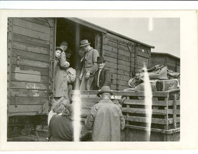 Keywords: arthur voth world war ii mennonite refugees mennonite central committee arthurvothworldwariimennoniterefugeesmennonitecentralcommittee baggage boxcars monochrome photo border Caption: June 21, 1948. Ham has safely arrived with the truck and trailer bringing the last group from Salzburg. Baggage is being unloaded; they left Linz the next day for Backnang - 32 people - the first Mennonites to officially leave Austria. Citation: Arthur Voth Photographs, 1947-1949. HM4-387 Box 1 Folder 2 photo 55. Mennonite Church USA Archives - Goshen. Goshen, Indiana. Caption: June 21, 1948. Ham has safely arrived with the truck and trailer bringing the last group from Salzburg. Baggage is being unloaded; they left Linz the next day for Backnang - 32 people - the first Mennonites to officially leave Austria. Citation: Arthur Voth Photographs, 1947-1949. HM4-387 Box 1 Folder 2 photo 55. Mennonite Church USA Archives - Goshen. Goshen, Indiana. |