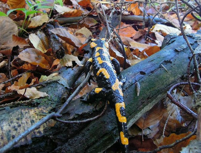 Keywords: upper bavaria nature forest animal amphibian newt salamander fire salamander spotted black yellow leaves disguised nature conservation