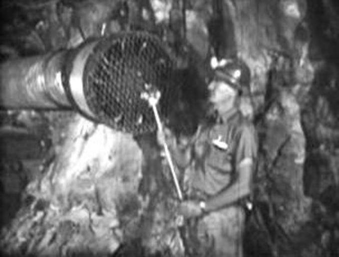 Keywords: Uranium Mine Airflow Measurement.JPG A uranium mine worker measures the airflow in front of a ventilation duct that provides the necessary protection from the accumulation of radon - a radioactive gas present in some rock formations US Bureau of Mines film Radiation Protection in Uranium Mines http //www archive org/details/Radon_in_mines s 1960 US Bureau of Mines Uranium mining Radiation protection Radon Health physics PD-USGov Mine ventilation Ventilation fans |