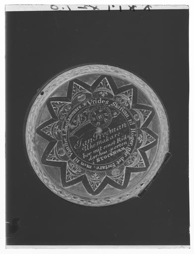 Keywords: Urfoder till ur (nr 1120-1121), möjligen tillverkat i England, namnchiffret efter svensk förlaga - Livrustkammaren - 45321-negative.tif LSH artwork sv Runt foder av stål med förgylld skoning av mässing med urtag för bärringens skaft Liten lockring med öppning för urtavlan d 43 mm locket fäst med gångjärn f'jäderlås av blånerat stål Lockets och underdelens sidor genombrutna i fint graverat rankverk På underdelens undersida inlagt i guld och polerat i nivå med stålet ett namnchiffer krönt med kunglig krona spegelmonogram C däromkring två korsade och nertill sammanbundna palmkvistar Invändigt klätt med ljusblått siden i underdelen en lös pappersetikett med firmatryck för urmakarmästaren och åldermannen i Stockholm Jan Fredman 1712-1767 original caption ca 1680 silk Färg blå material sidenatlas - brass - steel - gold g 195 size mm 433 21 53 LRK Karl XI av Sverige Fredrik Robert Martin Människan och tiden 1989 Människan och tiden 1990 Mästares verk - tidernas utst 1992 Vikings and their descendants 1996-1997 Kunglig tid 1999 Modelejon 2002 Tidens Form Nationalmuseum 2008 Kunglig tid place of origin original filename LN_E03951 37697 inventory number LRK 1122 45321 CC0 Urfoder till ur nr 1120-1121 möjligen tillverkat i England namnchiffret efter svensk förlaga - Livrustkammaren - 45321 tif <gallery caption Different images of same object > File Urfoder till ur nr 1120-1121 möjligen tillverkat i England namnchiffret efter svensk förlaga - Livrustkammaren - 53882 tif File Urfoder till ur nr 1120-1121 möjligen tillverkat i England namnchiffret efter svensk förlaga - Livrustkammaren - 71017 tif </gallery> <gallery caption Related objects > File Urverk signerat Thomas Tompion London ca 1680 - Livrustkammaren - 35327 tif LRK 1120 File Klocka T Tompion ca 1680 - Livrustkammaren - 47602 tif LRK 1120 File Boett till urverk möjligen tillverkat av boettmakaren Nathaniel Delander - Livrustkammaren - 28202 tif LRK 1121 File Klocka T Tompion ca 1680 - Livrustkammaren - 21921 tif LRK 1120 File Urverk signerat Thomas Tompion London ca 1680 - Livrustkammaren - 26766 tif LRK 1120 File Urverk signerat Thomas Tompion London ca 1680 - Livrustkammaren - 2518 tif LRK 1120 File Urverk signerat Thomas Tompion London ca 1680 - Livrustkammaren - 2531 tif LRK 1120 File Klocka T Tompion ca 1680 - Livrustkammaren - 13360 tif LRK 1120 File Boett till urverk nr 1120 möjligen tillverkat av boettmakaren boxmaker Nathaniel Delander - Livrustkammaren - 79576 tif LRK 1121 File Klocka T Tompion ca 1680 - Livrustkammaren - 56163 tif LRK 1120 File Urverk signerat Thomas Tompion London ca 1680 - Livrustkammaren - 11091 tif LRK 1120 File Urverk signerat Thomas Tompion London ca 1680 - Livrustkammaren - 19640 tif LRK 1120 </gallery> |