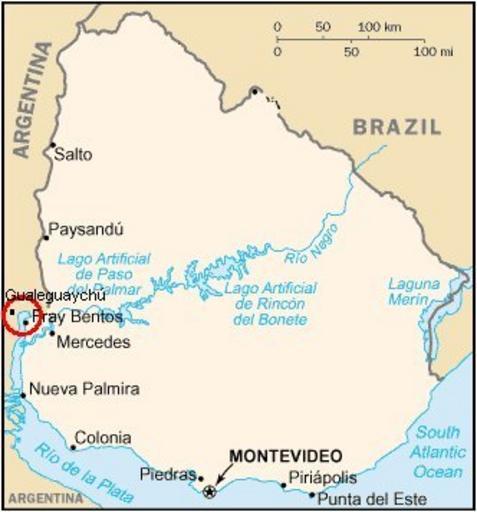 Keywords: Uruguay - Plantas de celulosa.jpg Uruguay map with cellulose plants area marked http //es wikipedia org/wiki/Imagen Uruguay_mapa png 2006-05-18 Pepe Robles over uruguay_mapa png own work over public domain map Uruguay Pulp mill conflict between Argentina and Uruguay Fray Bentos UPM paper mill |