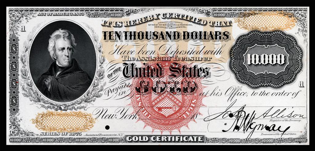 | Keywords: US-$10000-GC-1875-Fr-1166q PROOF.jpg Bureau of Engraving and Printing proof of a 10 000 Gold certificate Series of 1882 Fr Ref 1166q depicting Andrew Jackson Engraved signatures of Allison Register of the Treasury and Wyman Treasurer of the United States 2014-03-03 16 13 13 Image by Godot13 The Bureau of Engraving and Printing Institution Smithsonian National Museum of American History Use of this image should give credit to the National Numismatic Collection at the Smithsonian Institution 2013030510011547 <noinclude> DEFAULTSORT US- 10000-GC-1875-Fr-1166q PROOF jpg </noinclude> PD-USGov self cc-by-sa-4 0 Godot13 National Numismatic Collection <br>National Museum of American History Currency 2014 User Godot13 NNC Banknotes scanned by User Godot13 NNC United States Banknotes 1861-present Uploaded with UploadWizard 10000 United States dollar banknotes |
