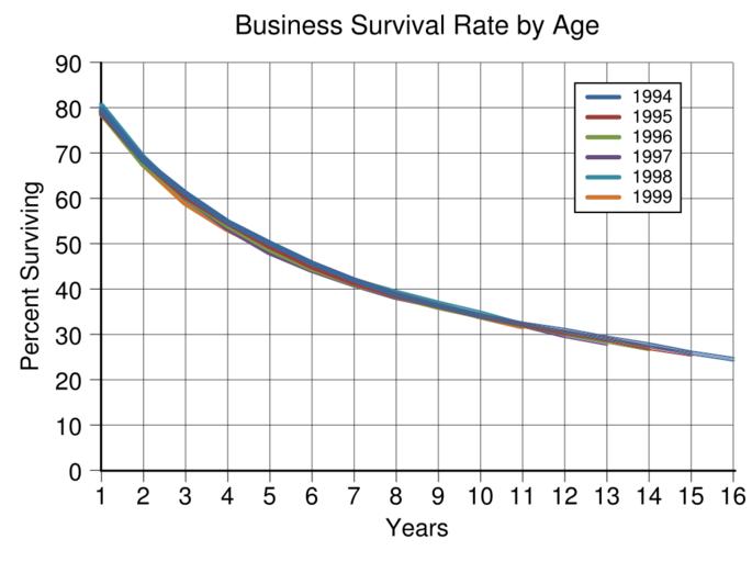 | Keywords: US business survival rate by age.svg en Business survival rate by number of years in business for businesses started from 1994 to 1999 Data from http //www bls gov/bdm/entrepreneurship/bdm_chart3 htm BLS 2016-03-09 own Delphi234 other versions Generated with Wikimedia SVG Chart SVG Chart/box cc-zero Statistics of the United States |