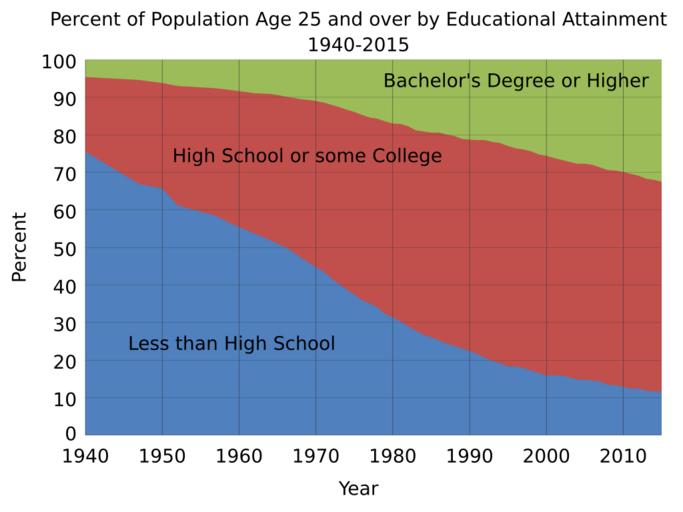Keywords: US education attainment by year.svg translate yes en Percent educational attainment in the United States by year from 1940 to 2015 Data from http //www census gov/hhes/socdemo/education/data/cps/historical/index html US Census CPS 2016-04-06 own Delphi234 other versions cc-zero Educational attainment statistics for the United States |