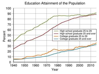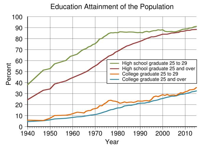 | Keywords: US educational attainment.svg en United States educational attainment of the population 25 years and over from 1940 to 2015 Data from https //www census gov/hhes/socdemo/education/data/cps/historical/index html US Census CPS Table A-2 2016-04-07 own Delphi234 other versions current annually Generated with Wikimedia SVG Chart SVG Chart/box cc-zero Educational attainment statistics for the United States | ||||