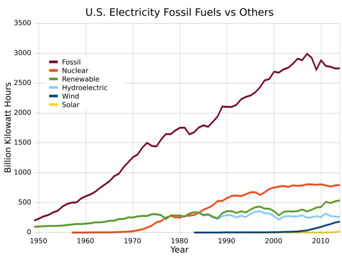| Keywords: US Electricity Fossil Fuel vs Other.svg translate yes en US electrical generation Fossil fuels vs nuclear and renewable energy Also shown is generation from hydroelectricity wind and solar Source data from http //www eia gov/totalenergy/data/annual/index cfm electricity Table 8 2a Table 7 2a 2014-06-10 own Delphi234 current annually cc-zero Uploaded with UploadWizard Electricity in the United States Fossil fuels Electricity production trends | ||||