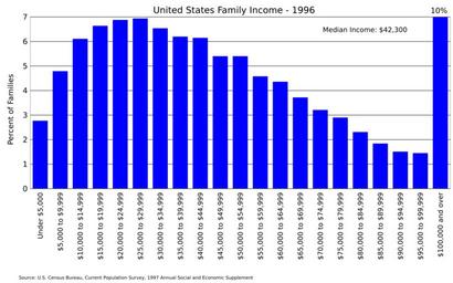 Keywords: US family income 1996.svg en United States family income distribution for 1996 Data from US Census https //www census gov/data/tables/time-series/demo/income-poverty/cps-finc/finc-01 html FINC-01 2016-06-16 own Delphi234 other versions cc-zero Income distribution in the United States |