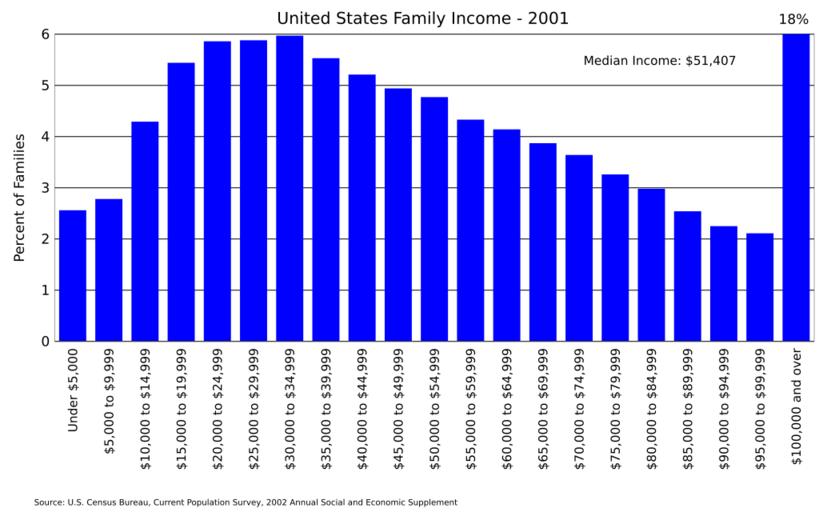 | Keywords: US family income 2001.svg en United States family income distribution for 2001 Data from US Census https //www census gov/data/tables/time-series/demo/income-poverty/cps-finc/finc-01 html FINC-01 2016-06-16 own Delphi234 other versions cc-zero Income distribution in the United States |