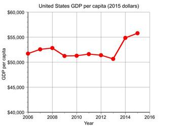 | Keywords: US GDP per capita.svg en GDP per capita of the United States in constant 2015 dollars Data from CIA https //www cia gov/library/publications/the-world-factbook/rankorder/2004rank html World Factbook 2016-06-03 own Delphi234 other versions current annually Generated with Wikimedia SVG Chart SVG Chart/box Data wikitable sortable - Year GDP per capita In 2015 dollars - 2006 44 000 51 730 - 2007 46 000 52 584 - 2008 48 000 52 841 - 2009 46 400 51 262 - 2010 47 200 51 304 - 2011 49 000 51 631 - 2012 49 800 51 410 - 2013 49 800 50 668 - 2014 54 800 54 865 - 2015 55 800 55 800 cc-zero Gross domestic product of the United States |