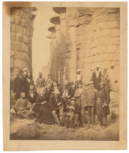 Keywords: US Grant & family at Karnak temple, 1878.jpg Original and large unsigned albumen photo 9 5 x 11 5 affixed to a 10 75 x 13 mount portraying U S Grant his wife Julia and his two sons Frederick and Jesse posing alongside their guides and porters at the Karnak Temple Complex near the ancient city of Thebes taken circa late January 1878 In fine condition with a few light dings and corner tip bends to image an area of toning to top left affecting just the corner tip of the image and some dings and soiling to mount In the March 4 1878 issue of the New York Herald John Russell Young a correspondent who accompanied Grant during his tour wrote in part ˜We gathered under the shade of a column and having carpeted a broken column for Mrs Grant sat around her and refreshed ourselves out of a basket ¦The General wears his pith helmet swathed in silk and you just catch a glimpse of the eyes and all the force of his brave kind strong face Mrs Grant sits near him shrinking from the sun ™ Grant ™s world tour began shortly after leaving the White House and spanned over two-and-a-half years with stops in England Germany China India Italy and Egypt http //www rrauction com/bidtracker_detail cfm IN 29 RR Auction 1878 unattributed PD-old Ulysses S Grant 1878 photographs